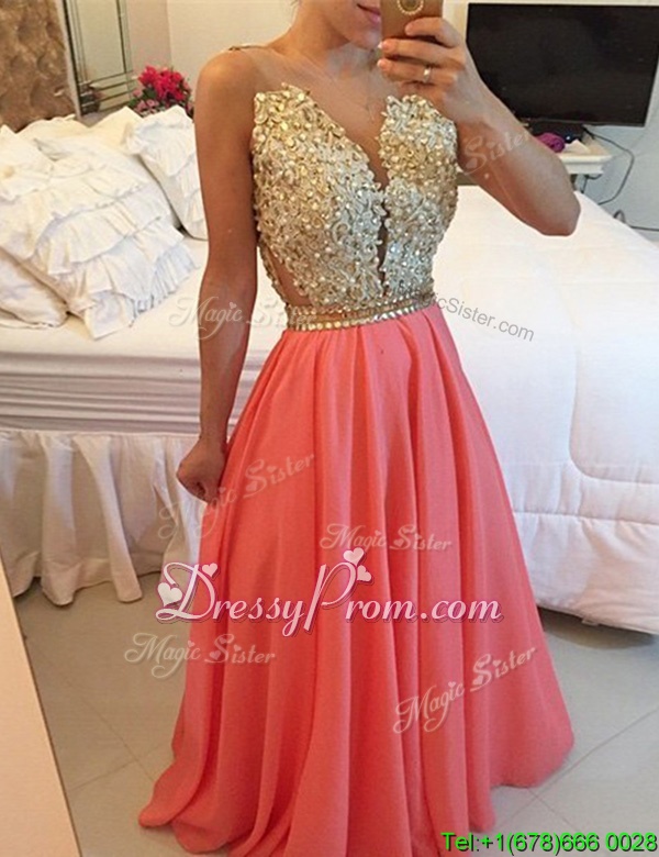 Neckline : V-neckShown Color : Watermelon RedSilhouette : A-lineSleeve Length : sleevelessHemline : floor lengthBack Detail : BacklessFabric : ChiffonEmbellishment : Beading,AppliquesOccasion : PromSeason : Spring,Summer,Fall