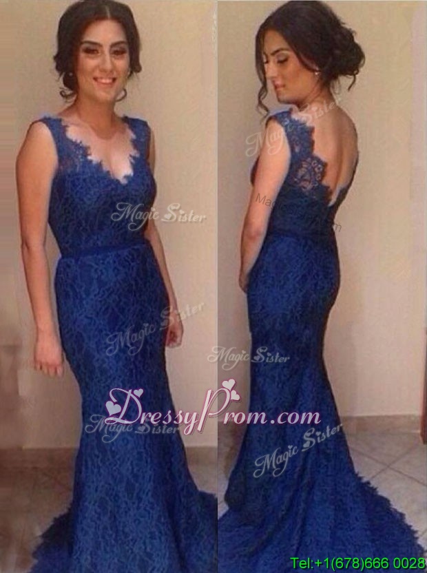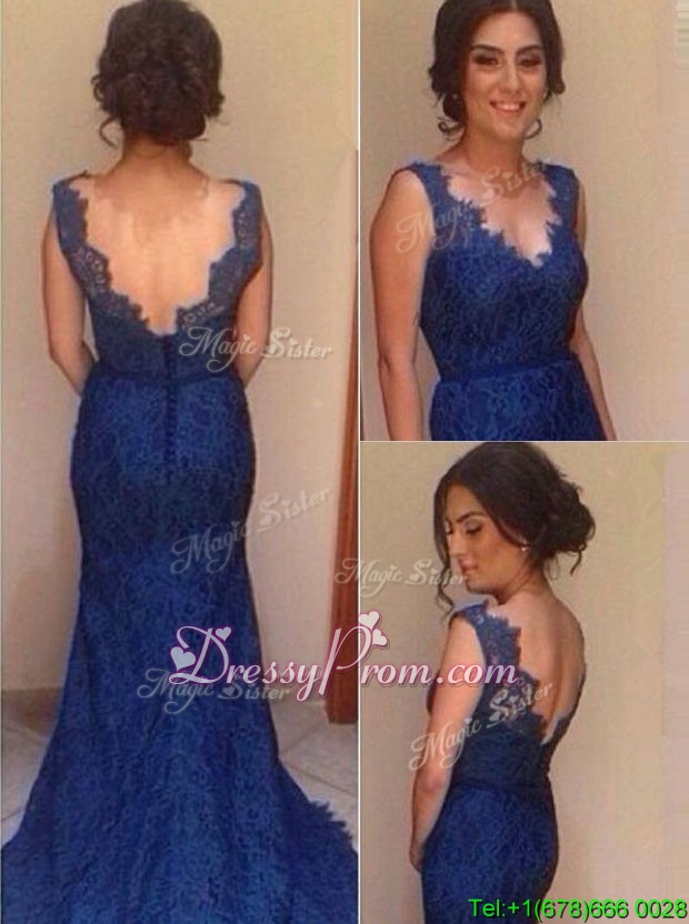 Neckline : V-neckShown Color : Royal BlueSilhouette : MermaidSleeve Length : sleevelessBack Detail : BacklessFabric : LaceEmbellishment : LaceOccasion : Prom,PartySeason : Spring,Summer,Fall