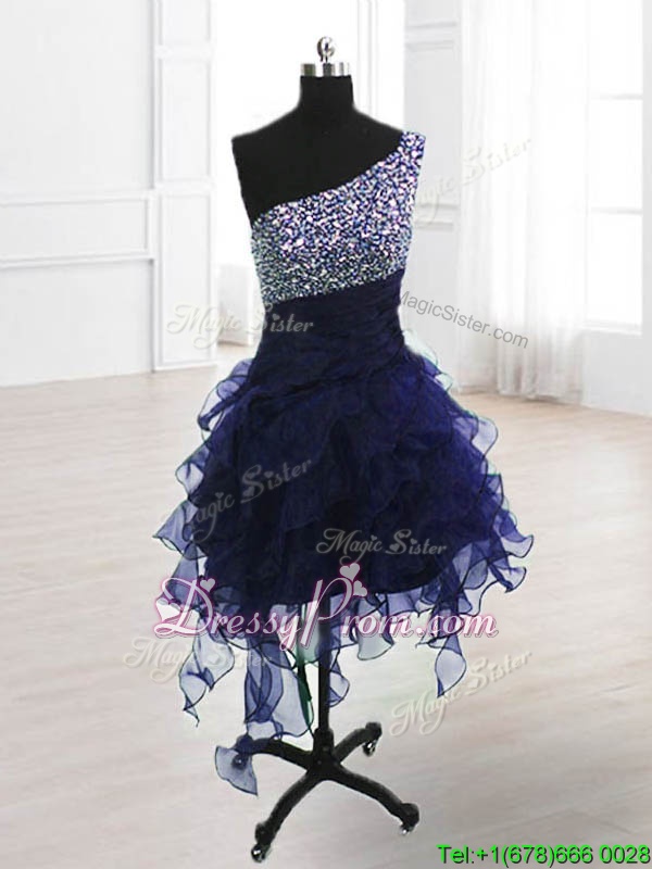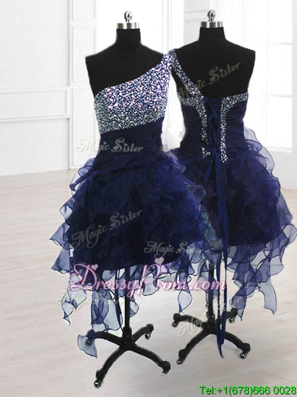 Neckline : One shoulderShown Color : Navy BlueSilhouette : A-lineSleeve Length : sleevelessHemline : knee lengthBack Detail : Lace upFabric : OrganzaEmbellishment : BeadingOccasion : Prom,PartySeason : Spring,Summer,Fall