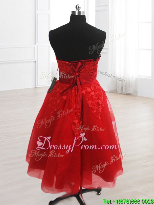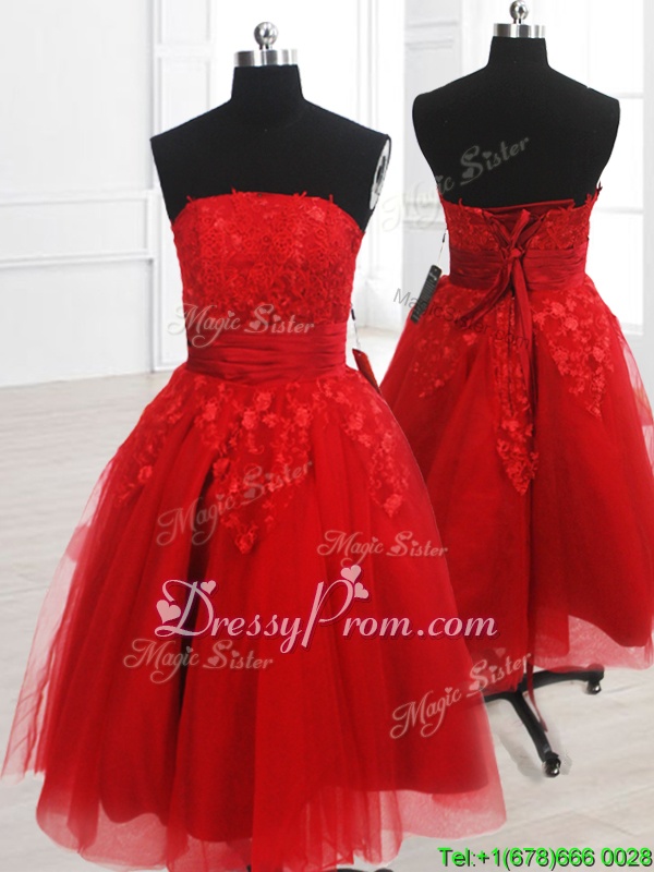 Neckline : StraplessShown Color : RedSilhouette : A-lineSleeve Length : sleevelessHemline : knee lengthBack Detail : Lace upFabric : OrganzaEmbellishment : EmbroideryOccasion : Prom,PartySeason : Spring,Summer,Fall