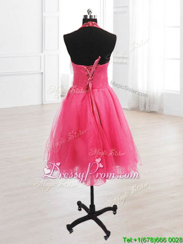 Sleeveless Organza Knee Length Lace Up Prom Gown in Hot Pink for with Sequins
