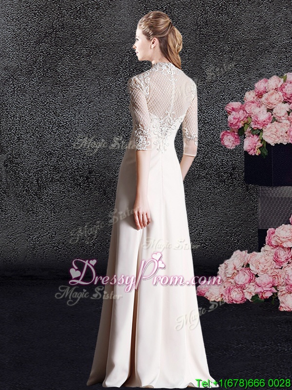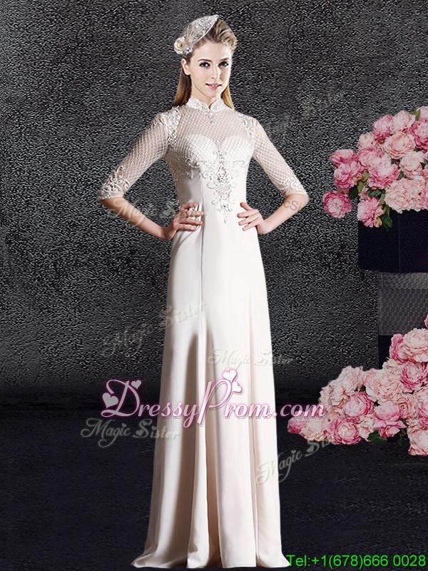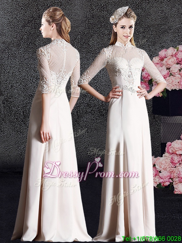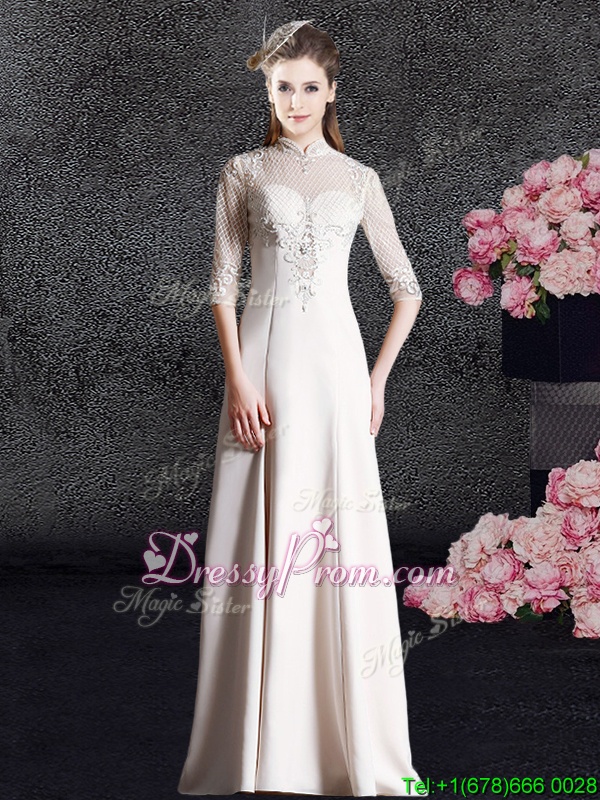 Neckline : High-neckShown Color : ChampagneSilhouette : Column/SheathSleeve Length : half sleevesHemline : floor lengthBack Detail : ZipperFabric : SatinEmbellishment : LaceOccasion : Prom,Military Ball,Wedding PartySeason : Spring,Summer,Fall,Winter