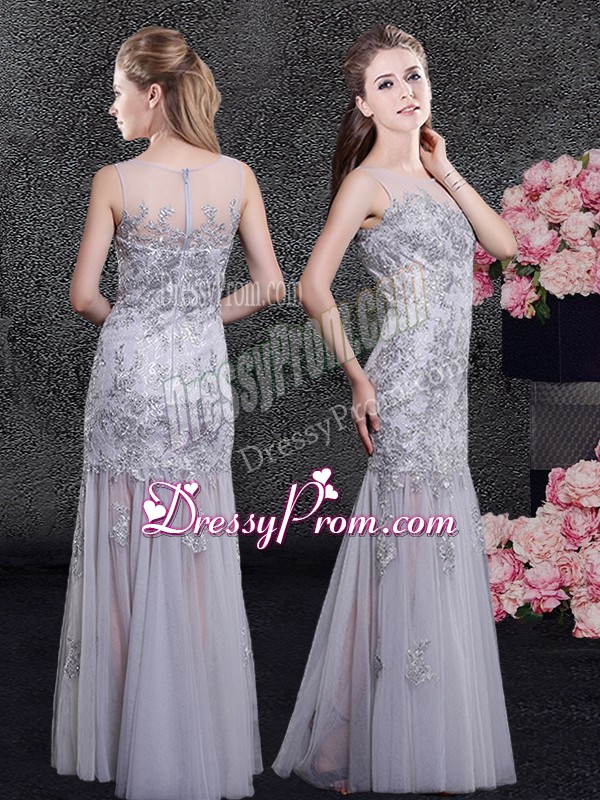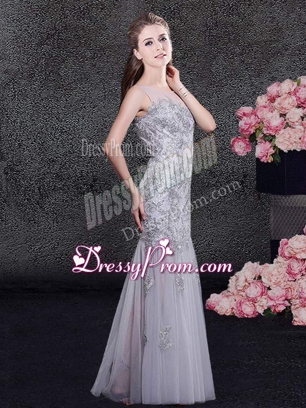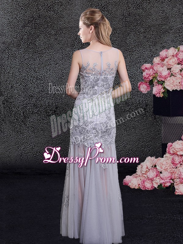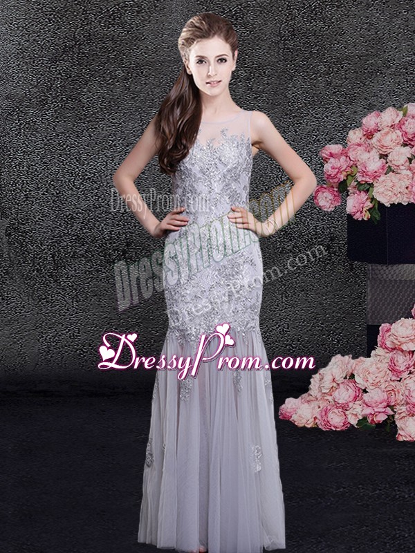 Neckline : ScoopShown Color : GreySilhouette : Column/SheathSleeve Length : sleevelessHemline : floor lengthBack Detail : ZipperFabric : TulleEmbellishment : Lace,AppliquesOccasion : Prom,Military Ball,Wedding PartySeason : Spring,Summer,Fall,Winter