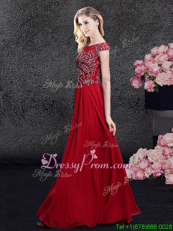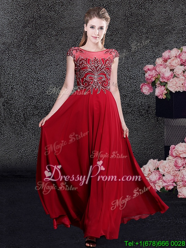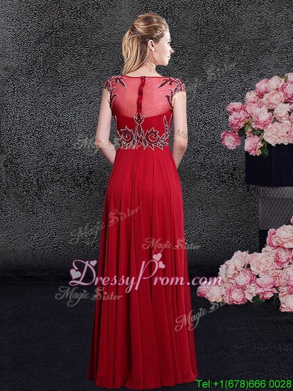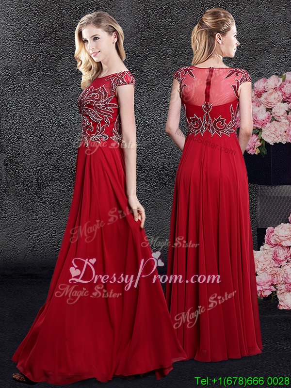 Neckline : ScoopShown Color : RedSilhouette : EmpireSleeve Length : cap sleevesHemline : floor lengthBack Detail : ZipperFabric : ChiffonEmbellishment : AppliquesOccasion : Prom,Party,Military Ball,Wedding PartySeason : Spring,Summer,Fall,Winter