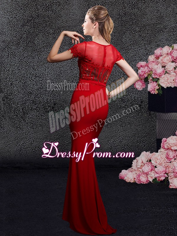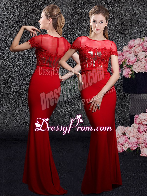 Neckline : ScoopShown Color : RedSilhouette : Column/SheathSleeve Length : short sleevesHemline : with trainBack Detail : ZipperFabric : Elastic Woven SatinEmbellishment : Appliques,SequinsOccasion : Prom,Party,Military Ball,Wedding PartySeason : Spring,Summer,Fall,Winter