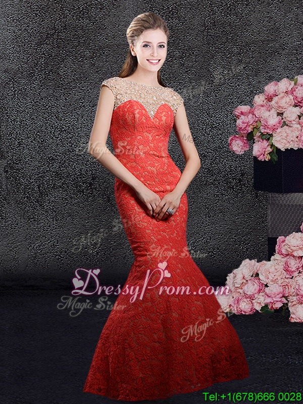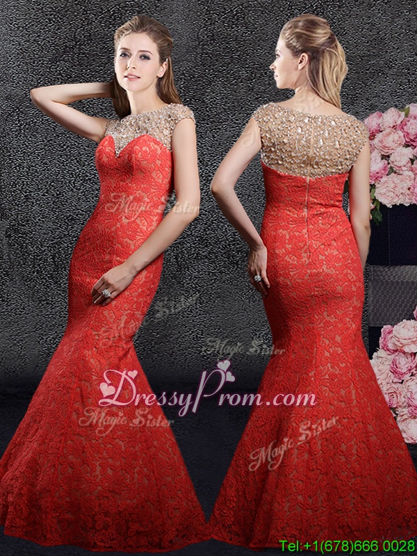 Neckline : BateauShown Color : RedSilhouette : MermaidSleeve Length : cap sleevesHemline : floor lengthBack Detail : ZipperFabric : LaceEmbellishment : Beading,LaceOccasion : Prom,Party,Military Ball,Wedding PartySeason : Spring,Summer,Fall,Winter