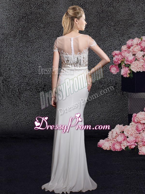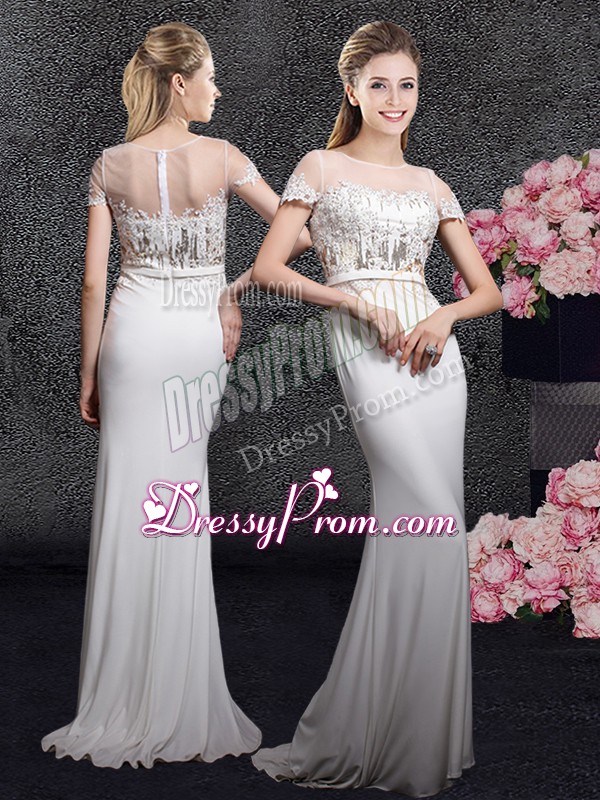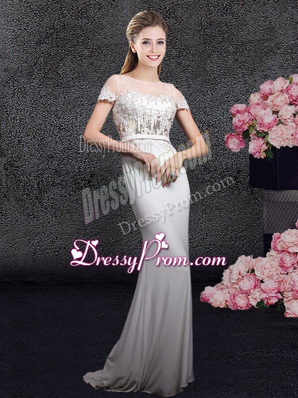 Neckline : ScoopShown Color : WhiteSilhouette : Column/SheathSleeve Length : short sleevesHemline : with trainBack Detail : ZipperFabric : Elastic Woven SatinEmbellishment : Appliques,SequinsOccasion : Prom,Party,Military Ball,Wedding PartySeason : Spring,Summer,Fall,Winter