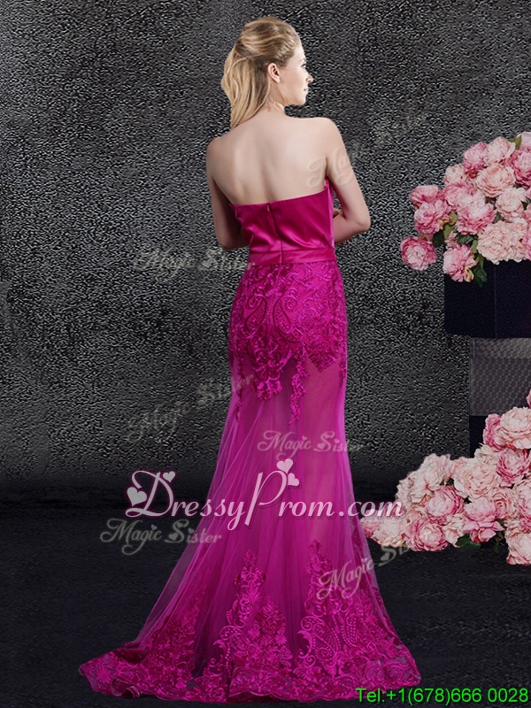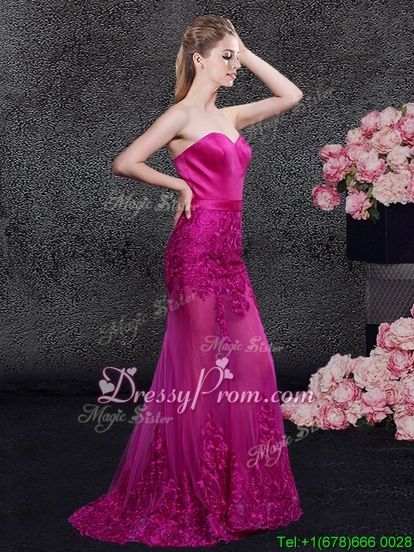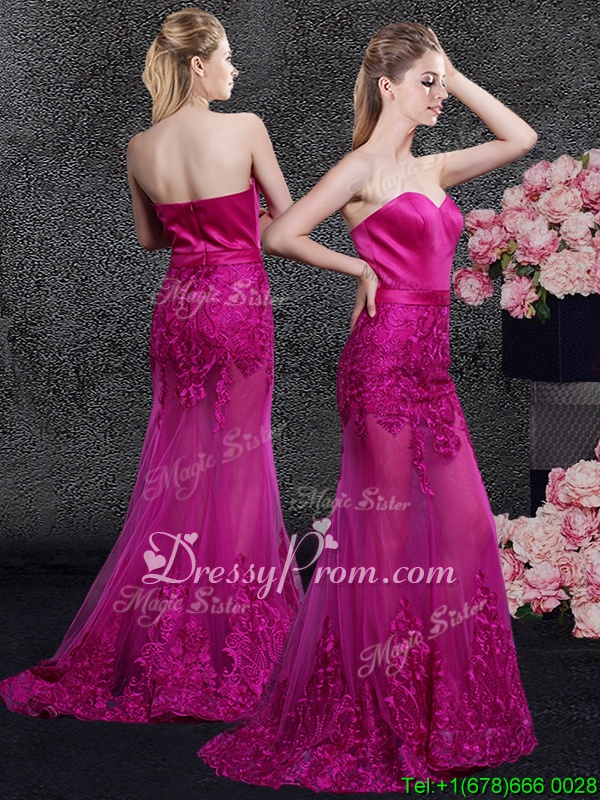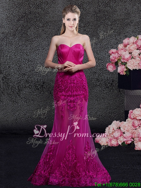 Neckline : SweetheartShown Color : FuchsiaSilhouette : MermaidSleeve Length : sleevelessHemline : floor lengthBack Detail : ZipperFabric : Satin,TulleEmbellishment : Lace,AppliquesOccasion : Prom,Military Ball,Wedding Party