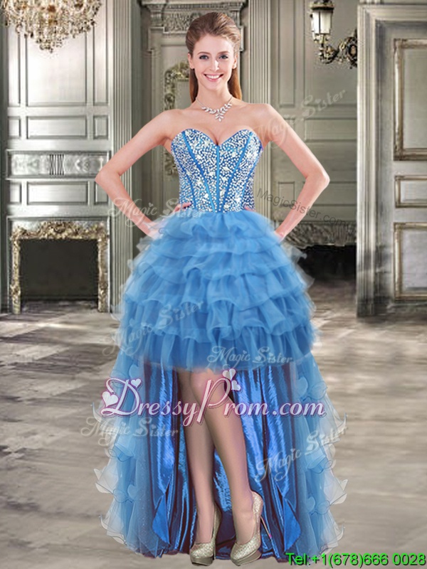Neckline : SweetheartShown Color : BlueSilhouette : A-lineSleeve Length : sleevelessHemline : high lowBack Detail : Lace upFabric : OrganzaEmbellishment : Beading,Ruffled LayersOccasion : Prom,PartySeason : Spring,Summer,Fall,Winter