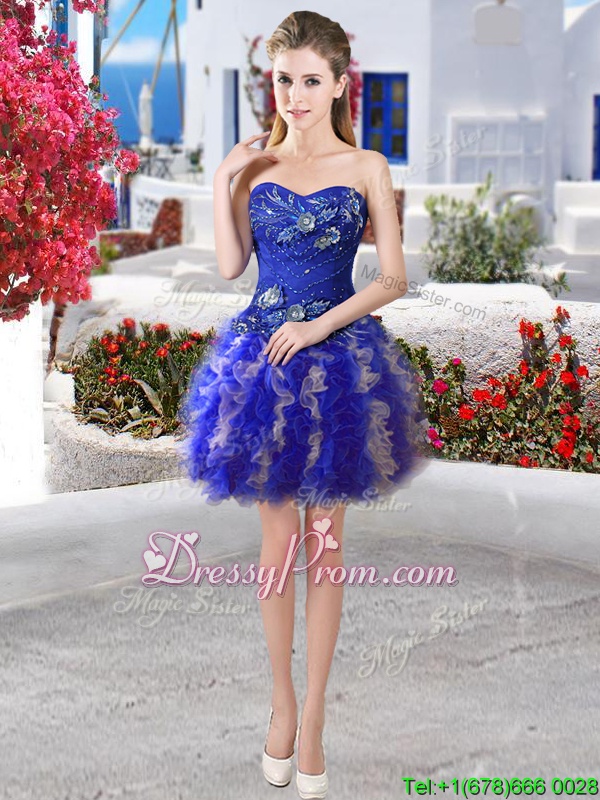 Neckline : SweetheartShown Color : Royal BlueSilhouette : Ball GownsSleeve Length : sleevelessHemline : mini lengthBack Detail : Lace upFabric : OrganzaEmbellishment : Appliques,RufflesOccasion : Prom,PartySeason : Spring,Summer,Fall,Winter