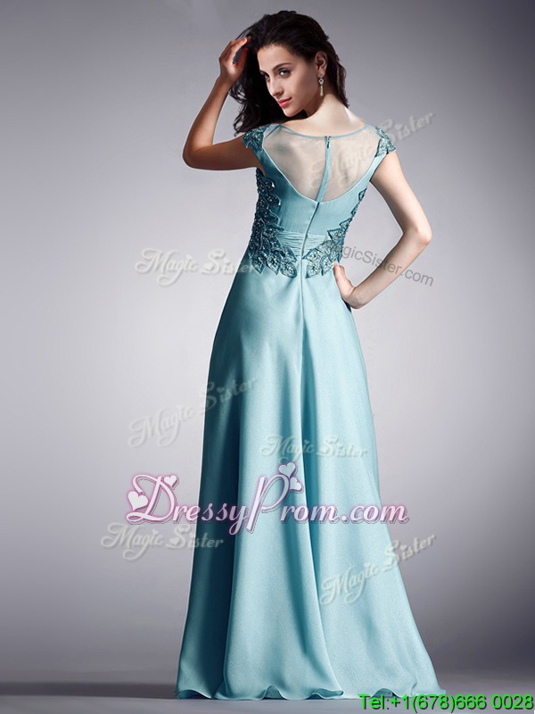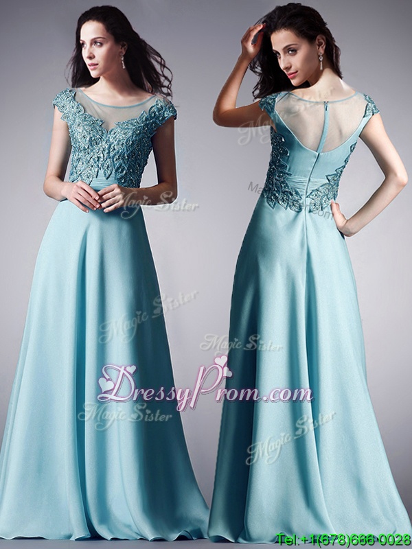 Neckline : ScoopShown Color : Light BlueSilhouette : Ball GownsSleeve Length : cap sleevesHemline : floor lengthBack Detail : ZipperFabric : ChiffonEmbellishment : AppliquesOccasion : PromSeason : Spring,Summer,Fall,Winter