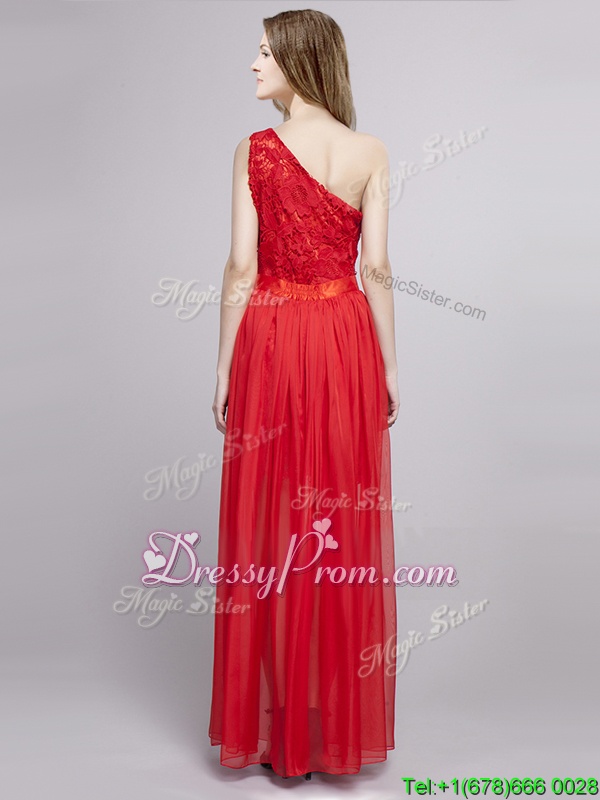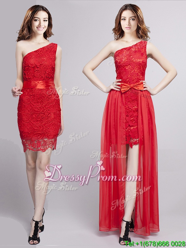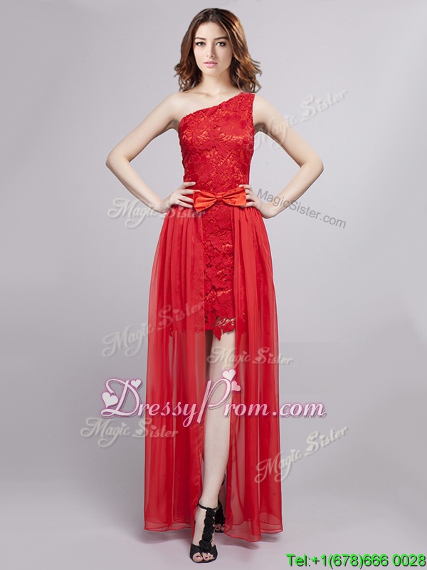 Neckline : One shoulderShown Color : RedSilhouette : EmpireSleeve Length : sleevelessHemline : floor lengthBack Detail : ZipperFabric : Tulle,LaceEmbellishment : Lace,BowknotOccasion : PromSeason : Spring,Summer,Fall