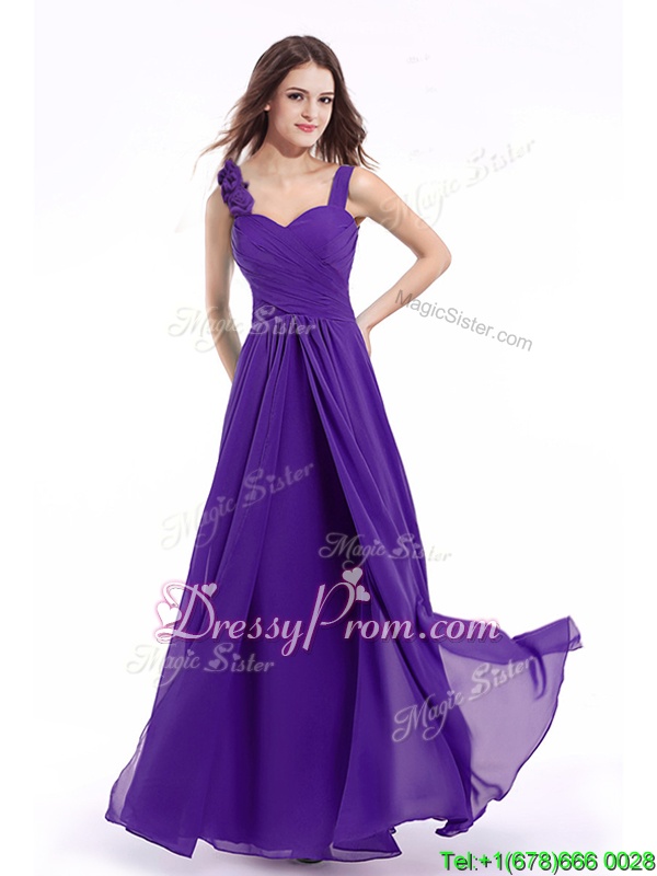 Neckline : StrapsShown Color : PurpleSilhouette : EmpireSleeve Length : sleevelessHemline : floor lengthBack Detail : ZipperFabric : ChiffonEmbellishment : Hand Made FlowerOccasion : PromSeason : Spring,Summer,Fall,Winter