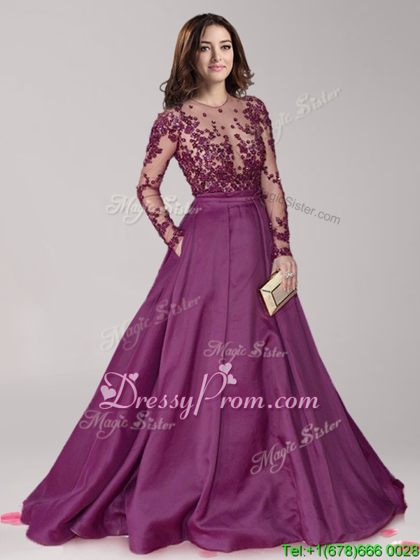 Neckline : ScoopShown Color : Dark PurpleSilhouette : A-lineSleeve Length : long sleevesHemline : with trainBack Detail : ZipperFabric : TaffetaEmbellishment : BeadingOccasion : PromSeason : Spring,Summer,Fall,Winter