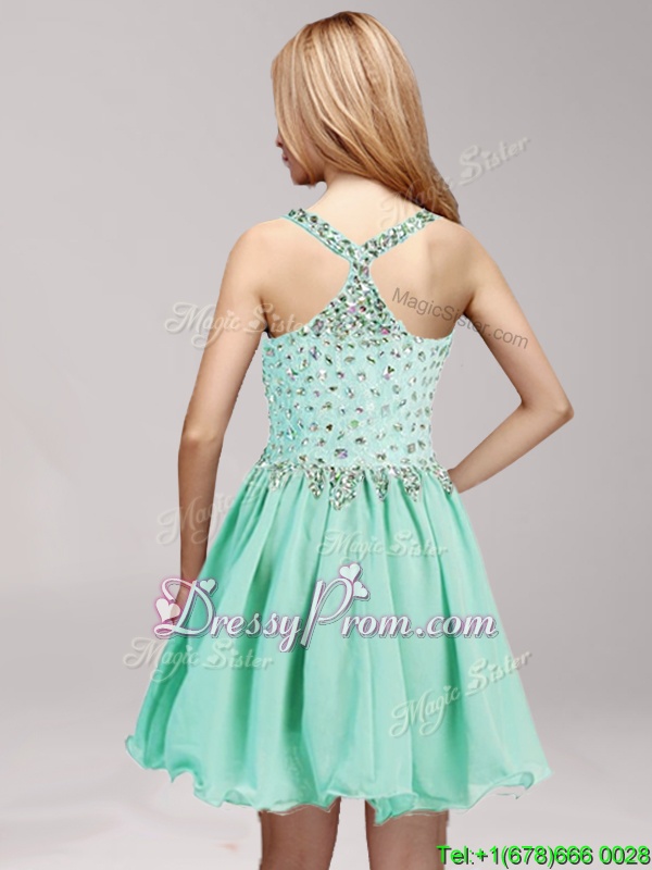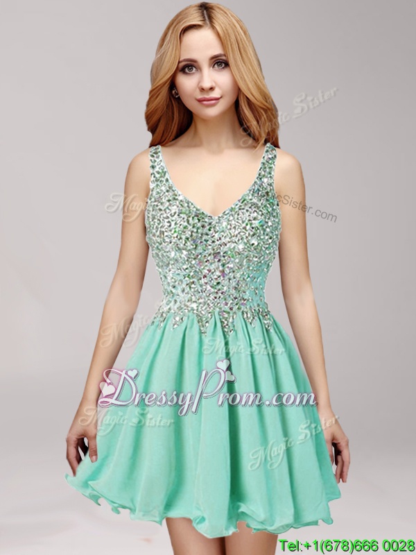 Neckline : StrapsShown Color : Apple GreenSilhouette : A-lineSleeve Length : sleevelessHemline : mini lengthBack Detail : Side zipperFabric : ChiffonEmbellishment : Beading,RufflesOccasion : Prom,PartySeason : Spring,Summer,Fall