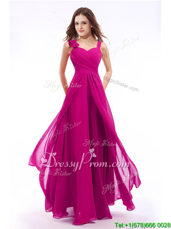 Neckline : StrapsShown Color : FuchsiaSilhouette : EmpireSleeve Length : sleevelessHemline : floor lengthBack Detail : ZipperFabric : ChiffonEmbellishment : Hand Made FlowerOccasion : PromSeason : Spring,Summer,Fall,Winter