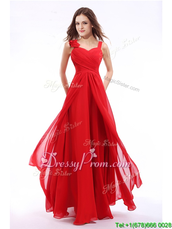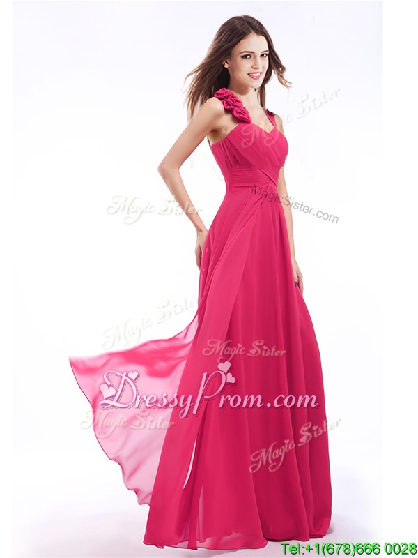 Neckline : StrapsShown Color : Hot PinkSilhouette : EmpireSleeve Length : sleevelessHemline : floor lengthBack Detail : ZipperFabric : ChiffonEmbellishment : Hand Made FlowerOccasion : PromSeason : Spring,Summer,Fall,Winter