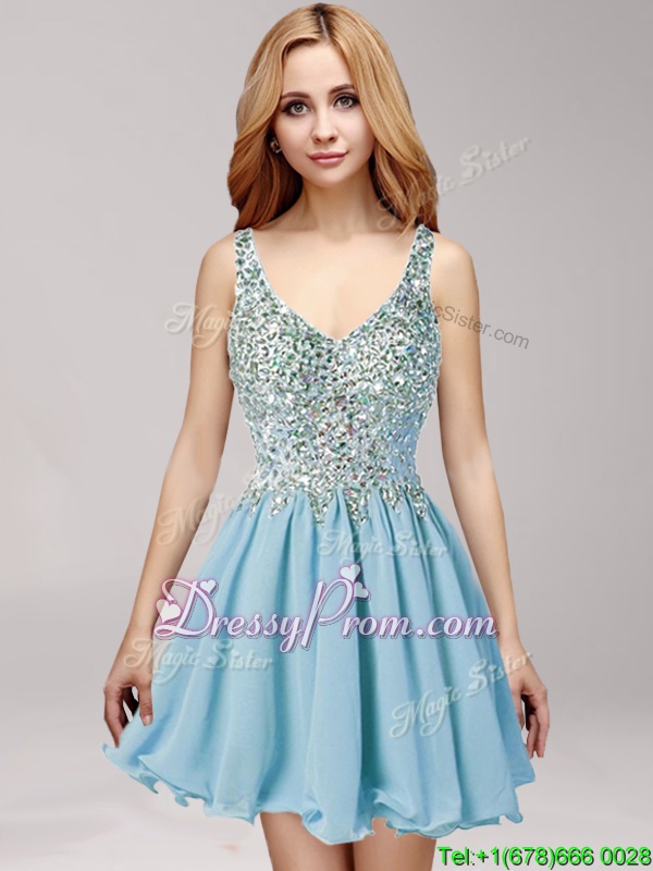 Neckline : StrapsShown Color : Light BlueSilhouette : A-lineSleeve Length : sleevelessHemline : mini lengthBack Detail : Side zipperFabric : ChiffonEmbellishment : Beading,RuchingOccasion : Prom,PartySeason : Spring,Summer,Fall