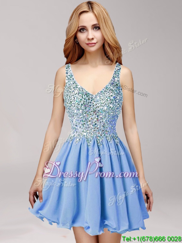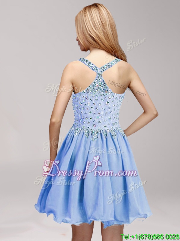 Neckline : StrapsShown Color : BlueSilhouette : A-lineSleeve Length : sleevelessHemline : mini lengthBack Detail : Criss crossFabric : ChiffonEmbellishment : Beading,RufflesOccasion : Prom,PartySeason : Spring,Summer,Fall