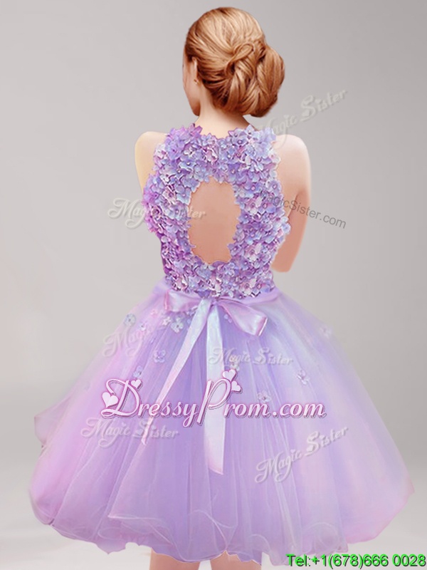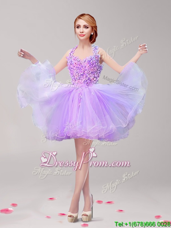 Neckline : Halter topShown Color : LavenderSilhouette : A-lineSleeve Length : sleevelessHemline : mini lengthBack Detail : BacklessFabric : TulleEmbellishment : Ruffles,Hand Made FlowerOccasion : PromSeason : Spring,Summer,Fall,Winter