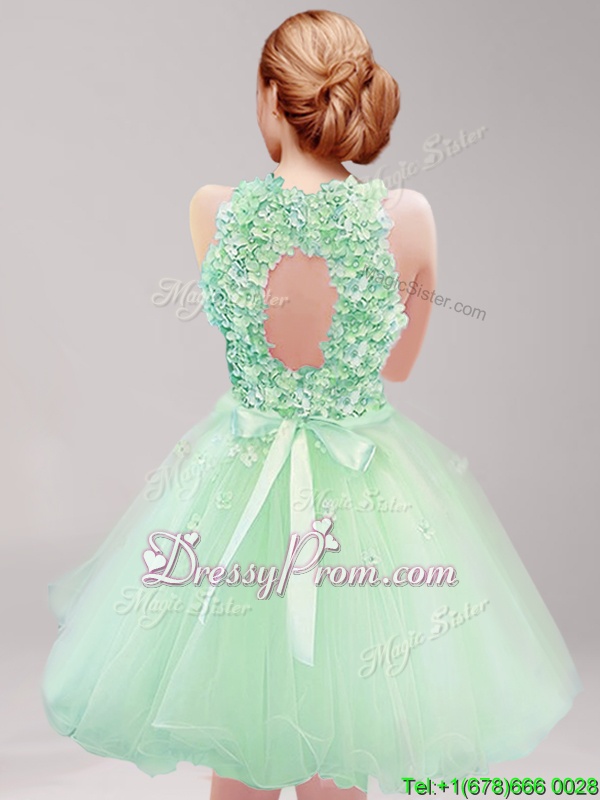 Neckline : Halter top Shown Color : Apple Green Silhouette : A-line Sleeve Length : sleeveless Hemline : mini length Back Detail : Backless Fabric : Tulle Embellishment : Ruffles,Hand Made Flower Occasion : Prom Season : Spring,Summer,Fall,Winter