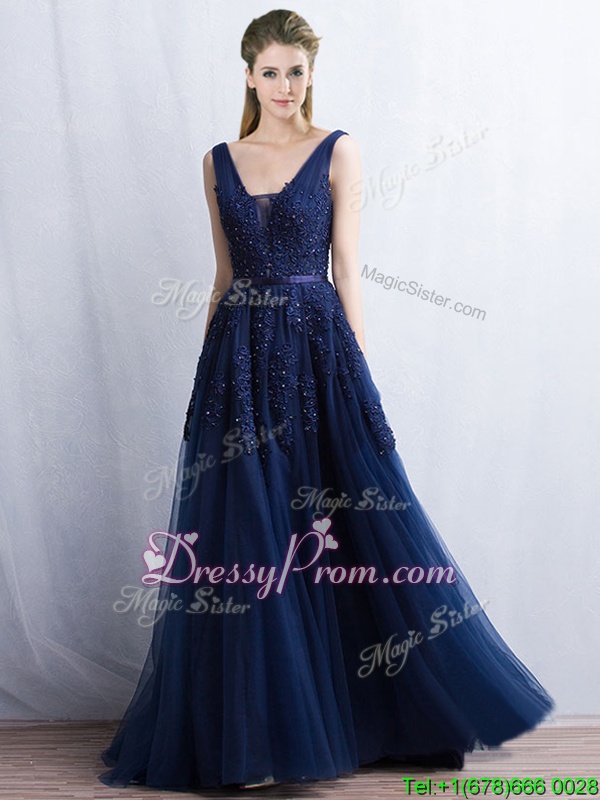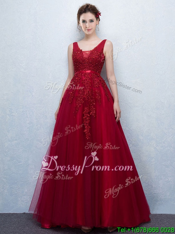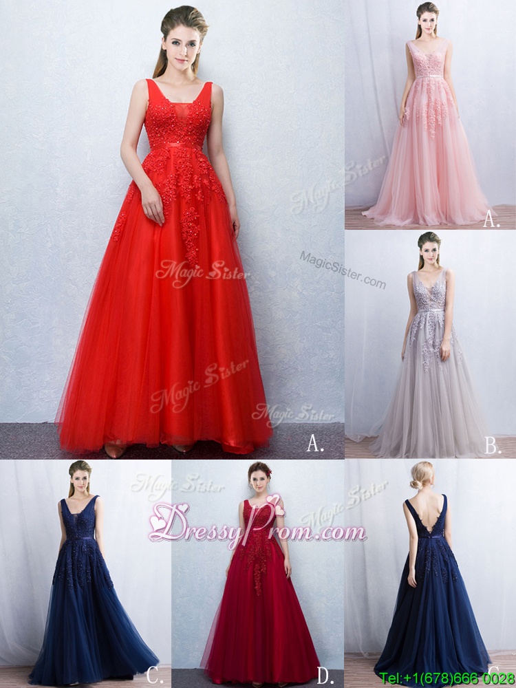 Neckline : V-neckShown Color : RedSilhouette : A-lineSleeve Length : sleevelessHemline : with trainBack Detail : BacklessFabric : TulleEmbellishment : Appliques,BeltOccasion : PromSeason : Spring,Summer,Fall,Winter