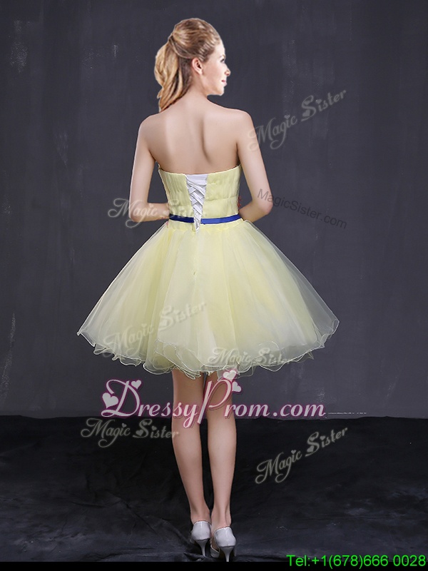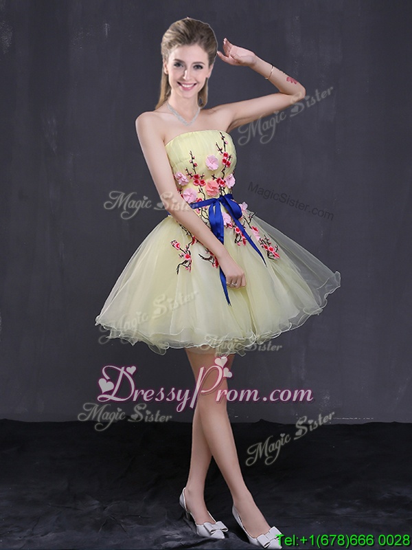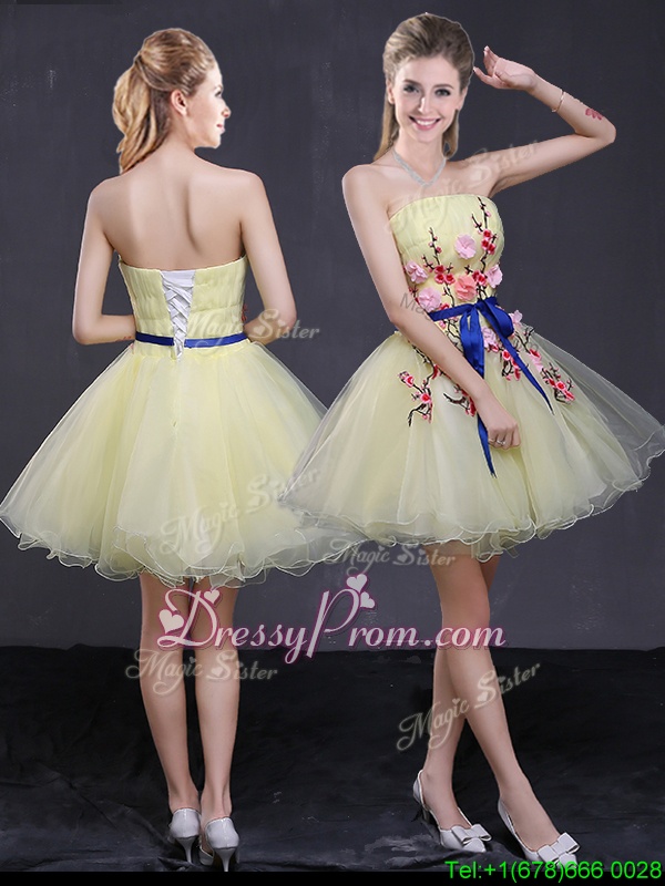 Neckline : StraplessShown Color : Light YellowSilhouette : A-lineSleeve Length : sleevelessHemline : mini lengthBack Detail : Lace upFabric : OrganzaEmbellishment : Appliques,BeltOccasion : Prom,PartySeason : Spring,Summer,Fall,Winter