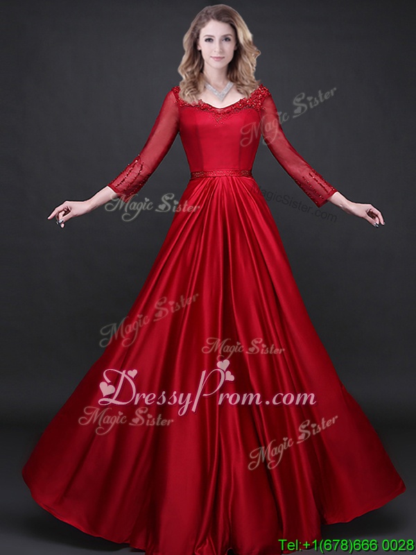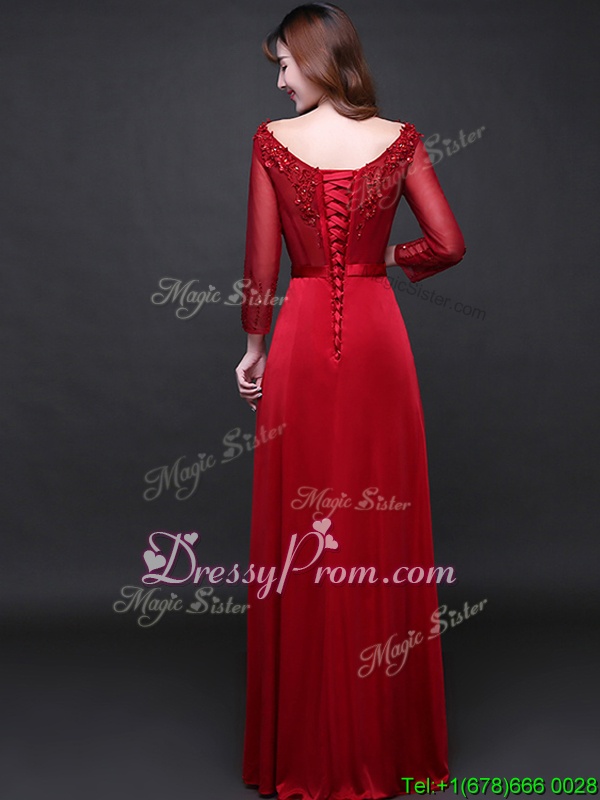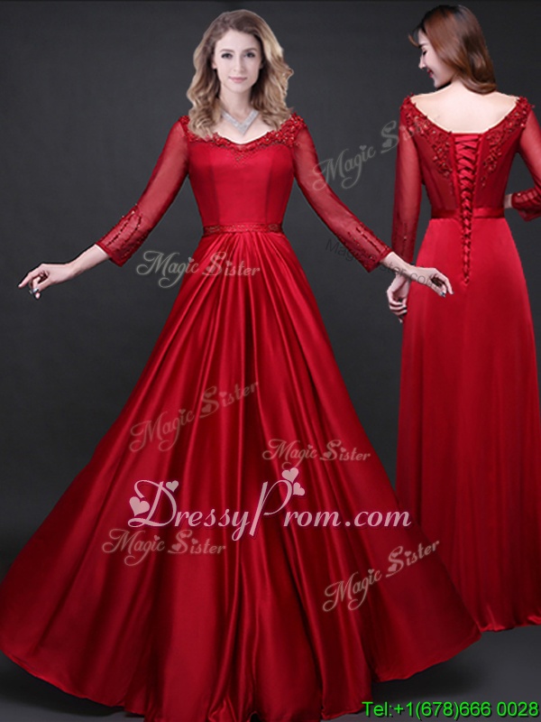 Shown Color : Wine RedSilhouette : EmpireSleeve Length : long sleevesHemline : floor lengthBack Detail : Lace upFabric : Elastic Woven SatinEmbellishment : Appliques,BeltOccasion : PromSeason : Spring,Summer,Fall,Winter