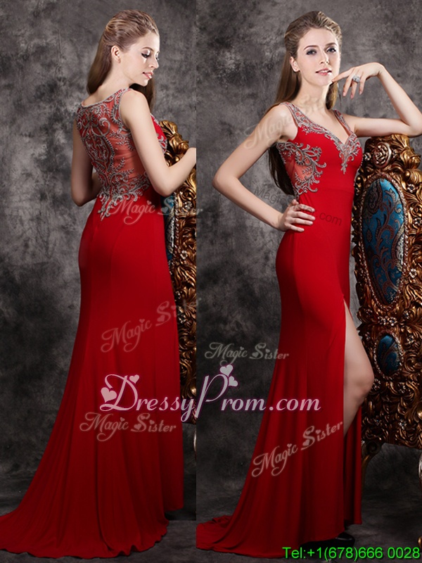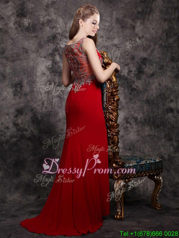 Shown Color : RedSilhouette : Column/SheathSleeve Length : sleevelessHemline : with trainBack Detail : ZipperFabric : ChiffonEmbellishment : AppliquesOccasion : PromSeason : Spring,Summer,Fall,Winter
