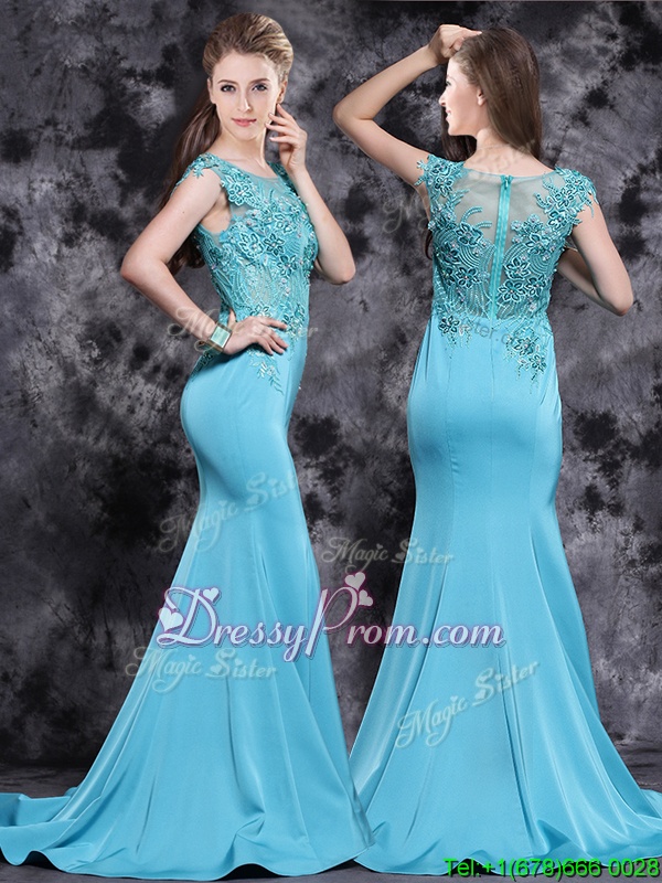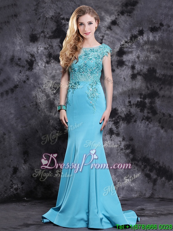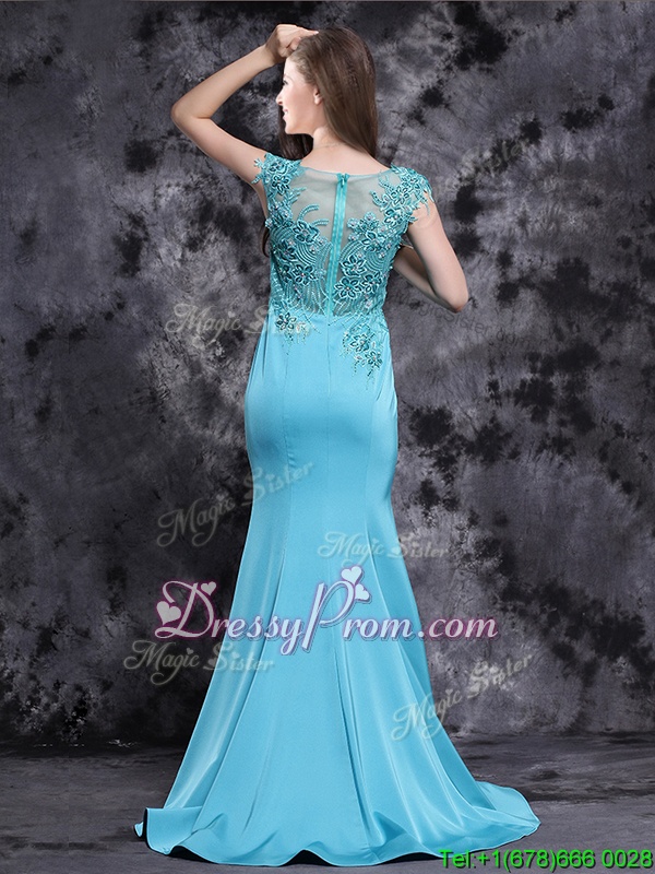 Neckline : ScoopShown Color : Aqua BlueSilhouette : MermaidSleeve Length : cap sleevesHemline : with trainBack Detail : ZipperFabric : SatinEmbellishment : AppliquesOccasion : PromSeason : Spring,Summer,Fall,Winter