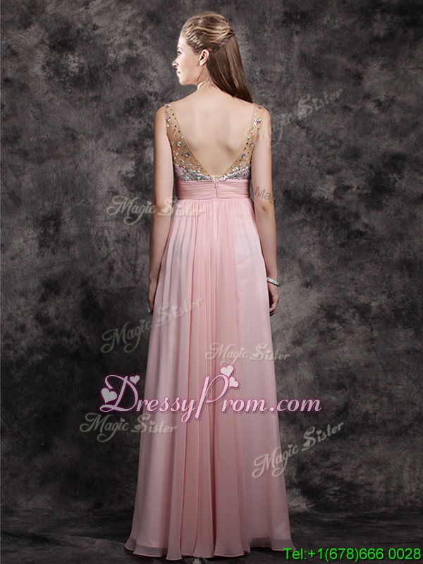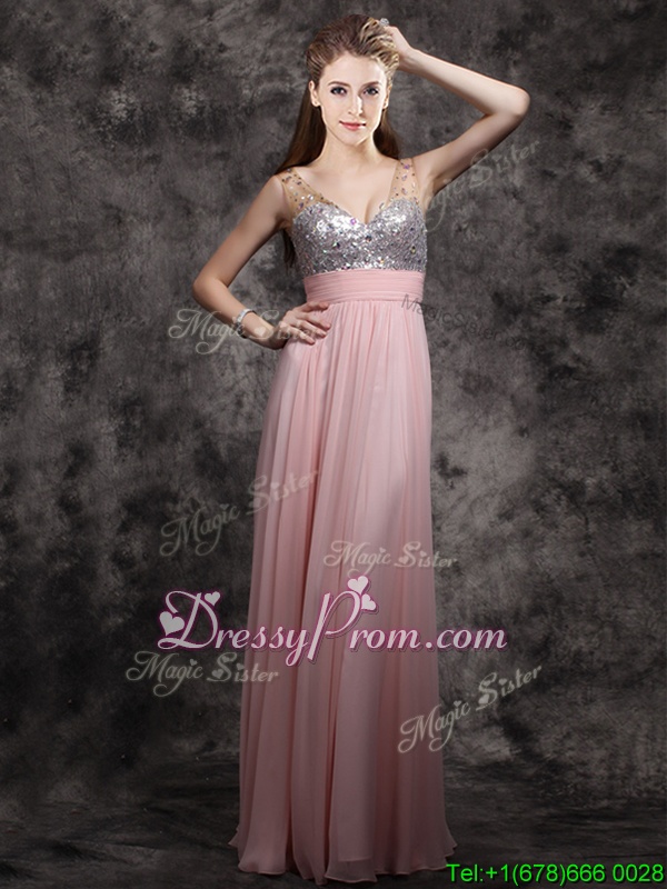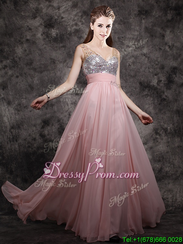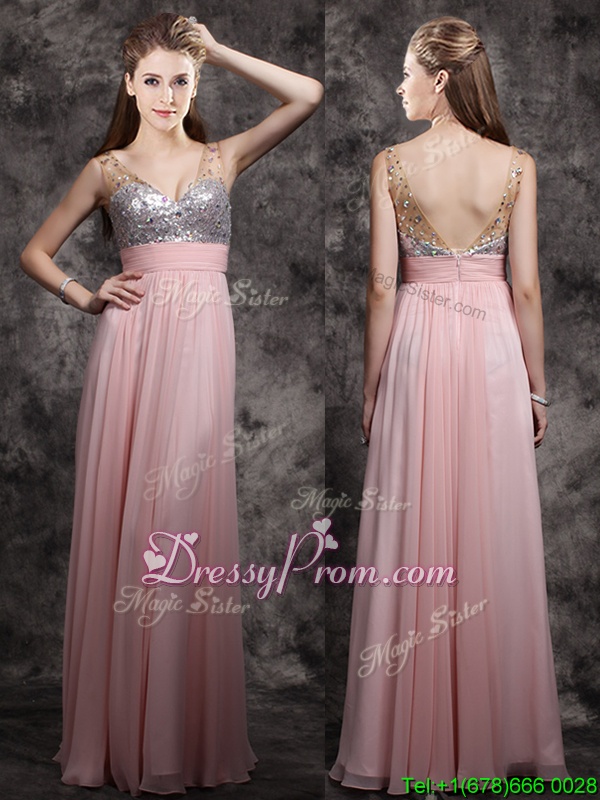 Neckline : V-neckShown Color : Baby PinkSilhouette : EmpireSleeve Length : sleevelessHemline : floor lengthBack Detail : ZipperFabric : ChiffonEmbellishment : Beading,SequinsOccasion : PromSeason : Spring,Summer,Fall,Winter