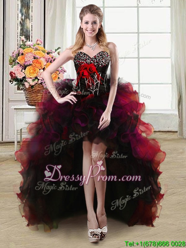 Neckline : SweetheartShown Color : RedSilhouette : Ball GownsSleeve Length : sleevelessHemline : high lowBack Detail : Lace upFabric : Organza,TulleEmbellishment : Beading,Ruffles,Hand Made FlowerOccasion : Prom,PartySeason : Spring,Summer,Fall
