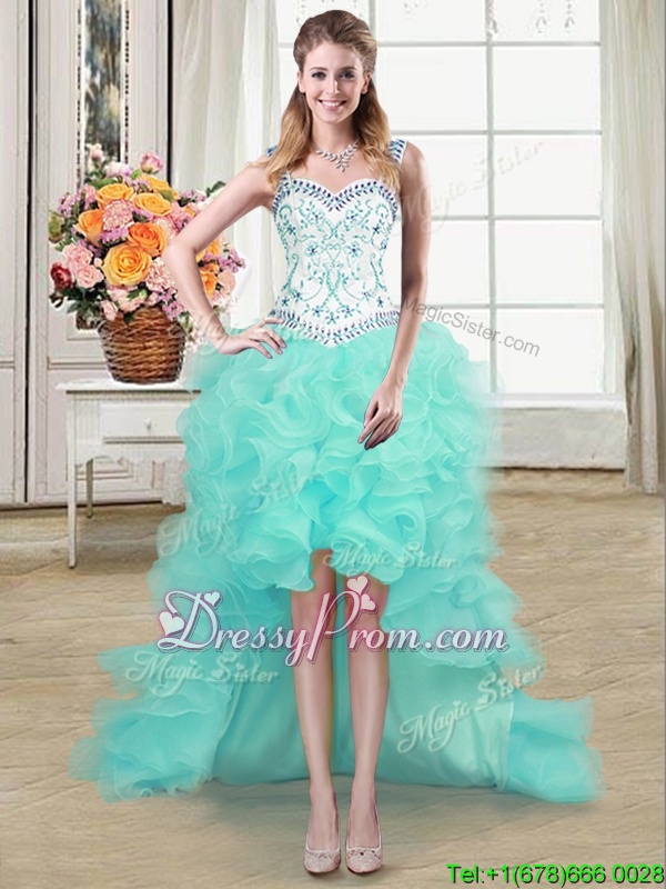 Neckline : StrapsShown Color : Aqua BlueSilhouette : Ball GownsSleeve Length : sleevelessHemline : high lowBack Detail : Lace upFabric : OrganzaEmbellishment : Beading,RufflesOccasion : Prom,PartySeason : Spring,Summer,Fall,Winter