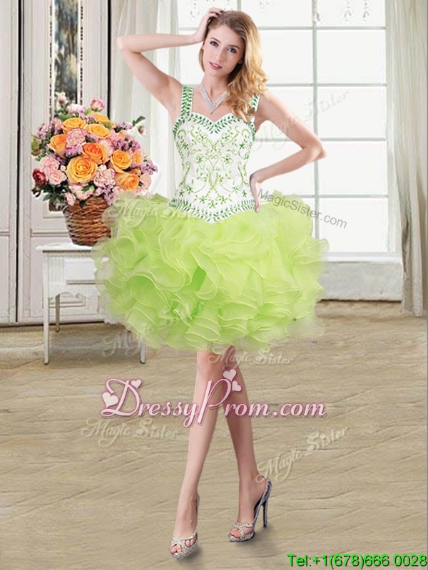 Neckline : StrapsShown Color : Yellow GreenSilhouette : Ball GownsSleeve Length : sleevelessHemline : floor lengthBack Detail : Lace upFabric : OrganzaEmbellishment : Beading,RufflesOccasion : Military Ball,Sweet 16,QuinceaneraSeason : Spring,Summer,Fall,Winter