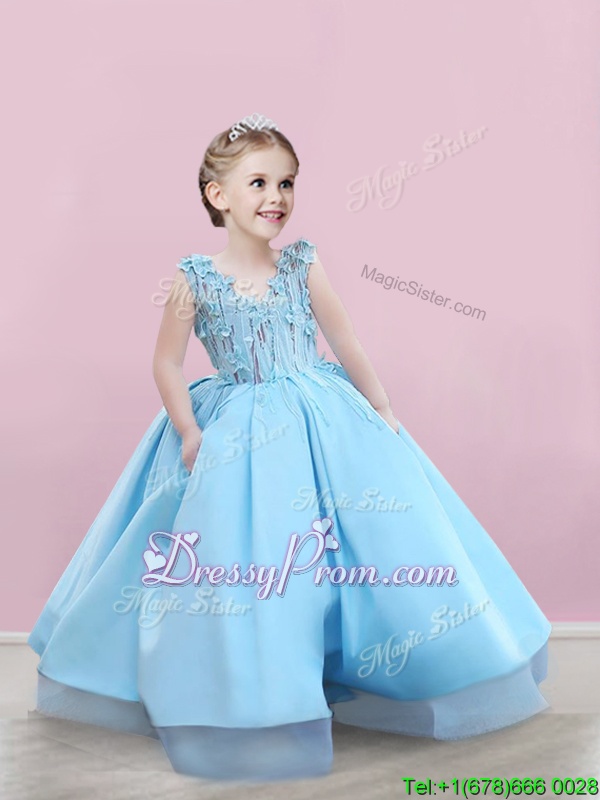 Shown Color : Baby BlueSilhouette : A-lineSleeve Length : sleevelessHemline : floor lengthBack Detail : Lace upFabric : SatinEmbellishment : AppliquesOccasion : Prom,PartySeason : Spring,Summer,Fall,Winter