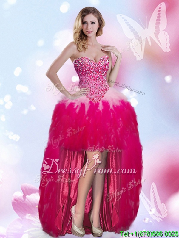 Neckline : SweetheartShown Color : Hot PinkSilhouette : Column/SheathSleeve Length : sleevelessHemline : high lowBack Detail : ZipperFabric : ChiffonEmbellishment : BeadingOccasion : Prom,PartySeason : Spring,Summer,Fall,Winter