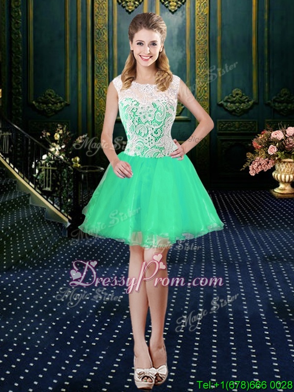 Neckline : ScoopShown Color : TurquoiseSilhouette : A-lineSleeve Length : sleevelessHemline : mini lengthBack Detail : ZipperFabric : OrganzaEmbellishment : LaceOccasion : Prom,Party,Military Ball,Wedding PartySeason : Spring,Summer,Fall