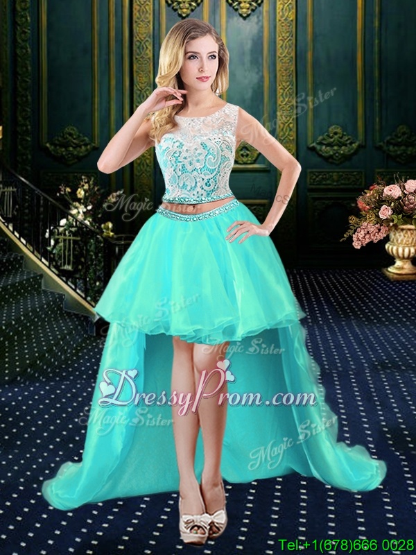 Neckline : ScoopShown Color : Aqua BlueSilhouette : A-lineSleeve Length : sleevelessHemline : high lowBack Detail : Clasp handleFabric : OrganzaEmbellishment : LaceOccasion : Prom,PartySeason : Spring,Summer,Fall,Winter