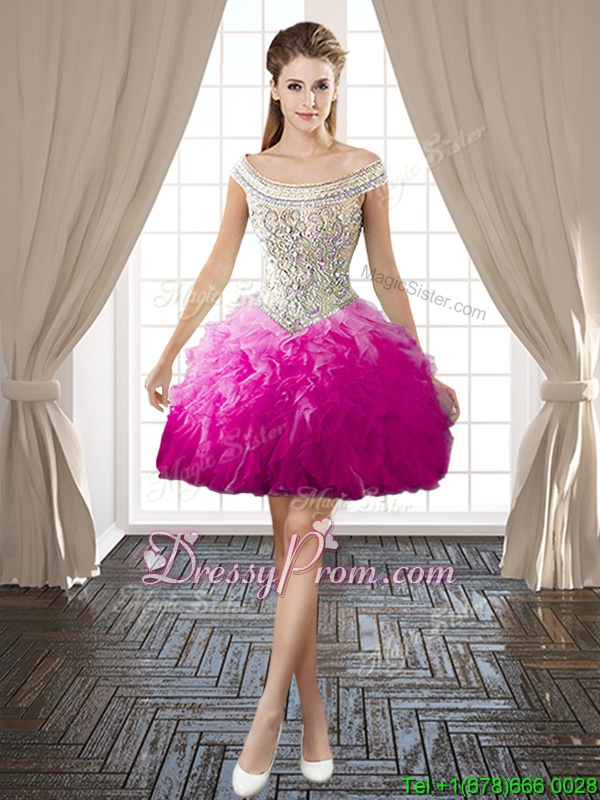 Neckline : Off the shoulderShown Color : FuchsiaSilhouette : Ball GownsSleeve Length : sleevelessHemline : mini lengthBack Detail : BacklessFabric : OrganzaEmbellishment : Beading,RufflesOccasion : Prom,PartySeason : Spring,Summer,Fall