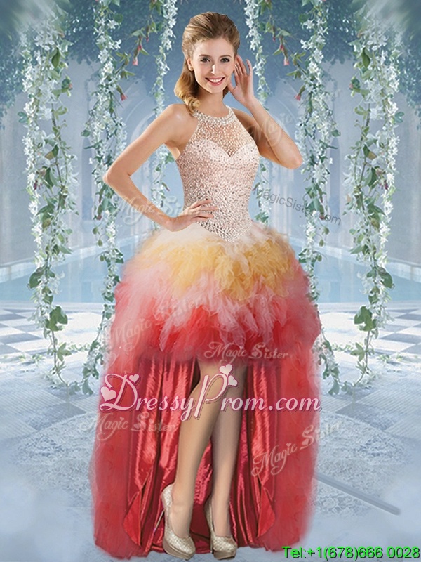 Neckline : Halter topShown Color : Multi-colorSilhouette : Ball GownsSleeve Length : sleevelessHemline : high lowBack Detail : Lace upFabric : TulleEmbellishment : Beading,RufflesOccasion : Prom,PartySeason : Spring,Summer,Fall