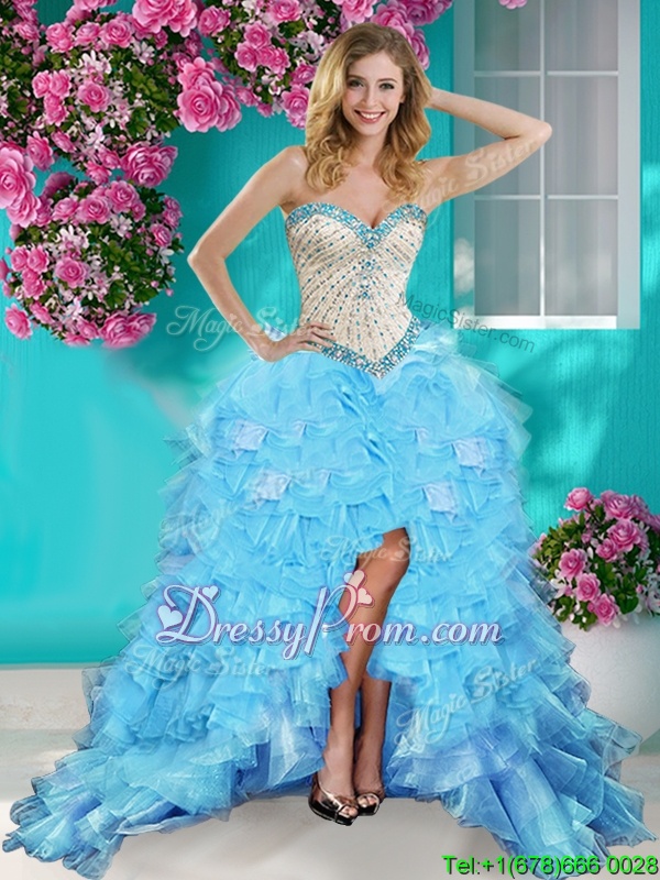 Neckline : SweetheartShown Color : Baby BlueSilhouette : Ball GownsSleeve Length : sleevelessHemline : high lowBack Detail : Lace upFabric : OrganzaEmbellishment : Beading,RufflesOccasion : Prom,PartySeason : Spring,Summer,Fall,Winter