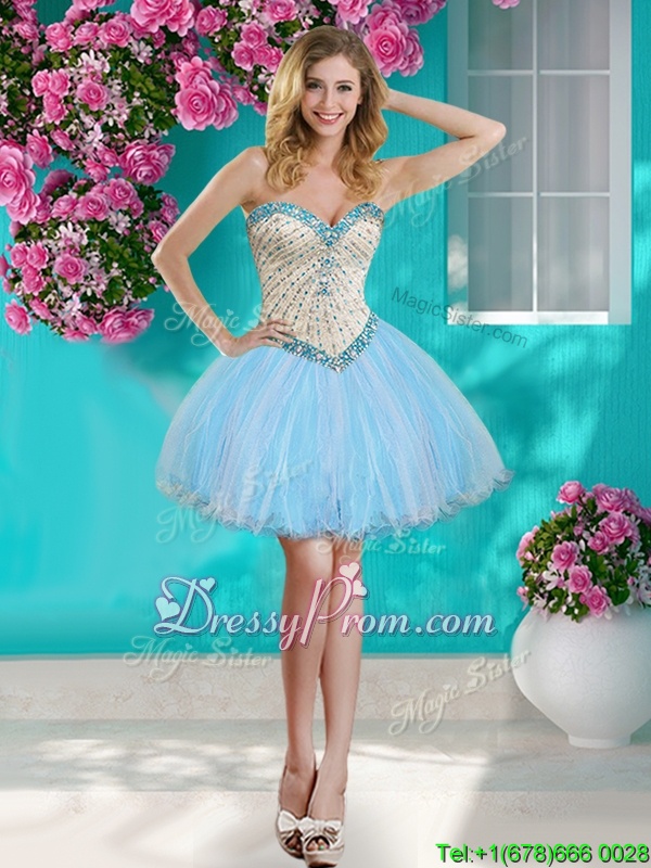 Neckline : SweetheartShown Color : Baby BlueSilhouette : Ball GownsSleeve Length : sleevelessHemline : mini lengthBack Detail : Lace upFabric : OrganzaEmbellishment : Beading,RufflesOccasion : Prom,PartySeason : Spring,Summer,Fall