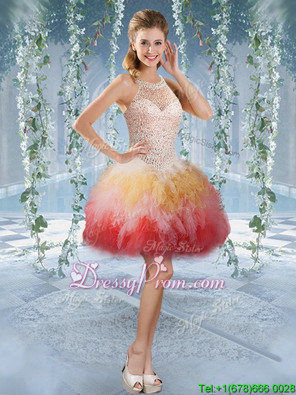 Neckline : Halter topShown Color : Multi-colorSilhouette : Ball GownsSleeve Length : sleevelessHemline : mini lengthBack Detail : Lace upFabric : TulleEmbellishment : Beading,EmbroideryOccasion : Prom,PartySeason : Spring,Summer,Fall