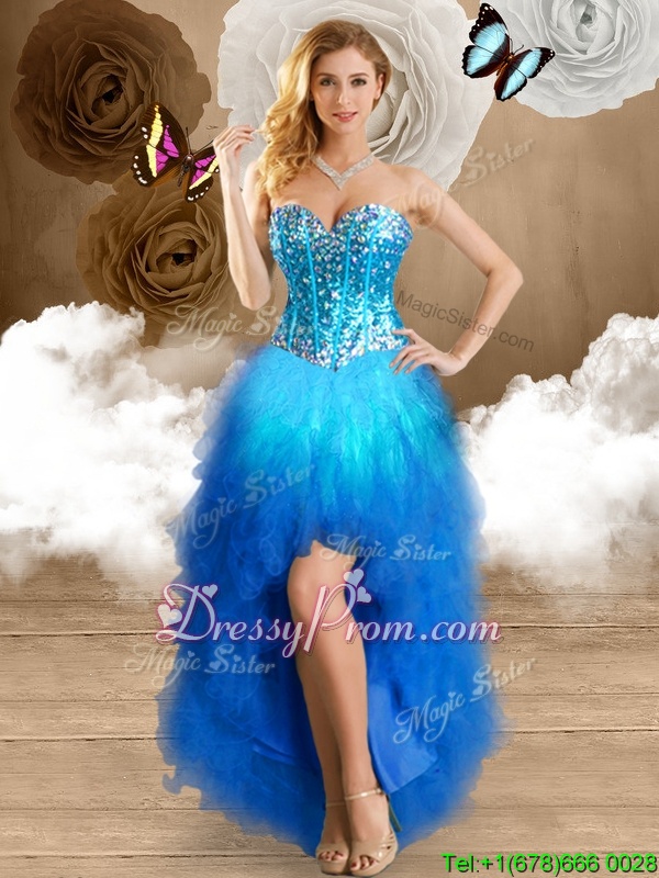 Neckline : SweetheartShown Color : Multi-colorSilhouette : Ball GownsSleeve Length : sleevelessHemline : high lowBack Detail : Lace upFabric : TulleEmbellishment : Beading,RufflesOccasion : Prom,PartySeason : Spring,Summer,Fall