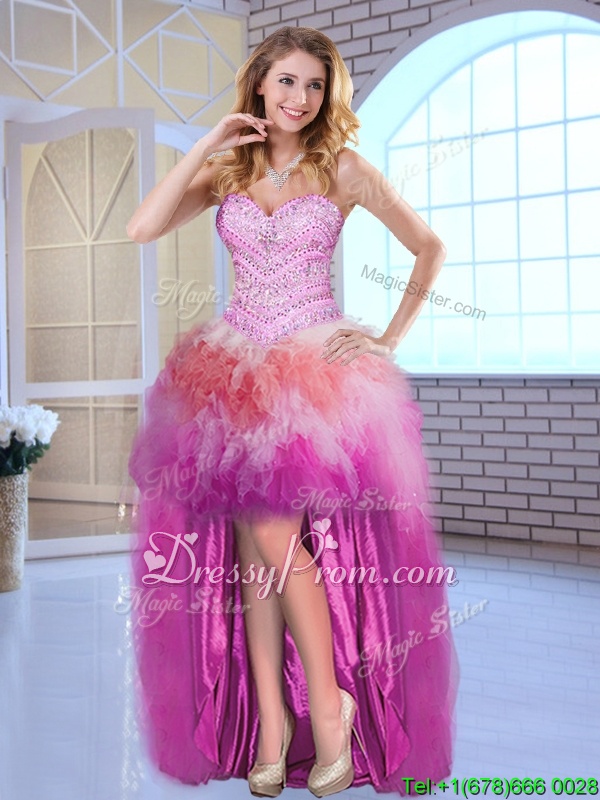 Neckline : SweetheartShown Color : Multi-colorSilhouette : Ball GownsSleeve Length : sleevelessHemline : high lowBack Detail : Lace upFabric : TulleEmbellishment : BeadingOccasion : PromSeason : Spring,Summer,Fall