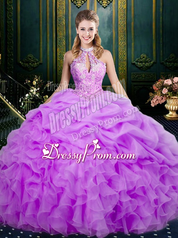Neckline : Halter topShown Color : LilacSilhouette : Ball GownsSleeve Length : sleevelessHemline : floor lengthBack Detail : Lace upFabric : OrganzaEmbellishment : Beading,Ruffles,Pick UpsOccasion : Military Ball,Sweet 16,QuinceaneraSeason : Spring,Summer,Fall,Winter