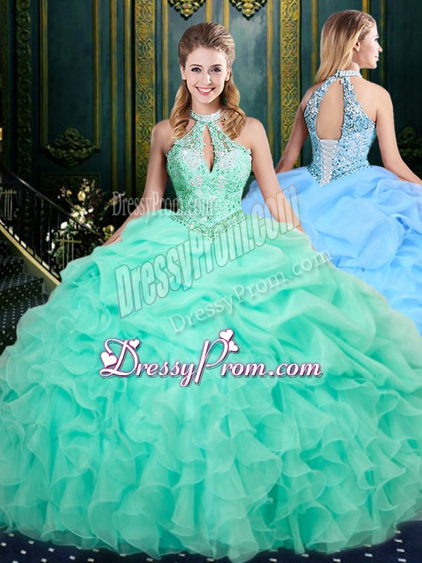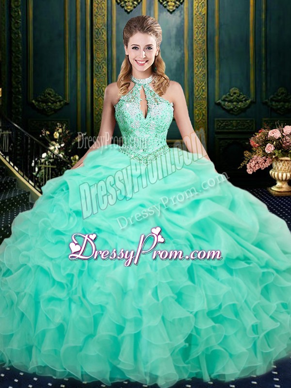 Neckline : Halter topShown Color : Apple GreenSilhouette : Ball GownsSleeve Length : sleevelessHemline : floor lengthBack Detail : Lace upFabric : OrganzaEmbellishment : Beading,Ruffles,Pick UpsOccasion : Military Ball,Sweet 16,QuinceaneraSeason : Spring,Summer,Fall,Winter