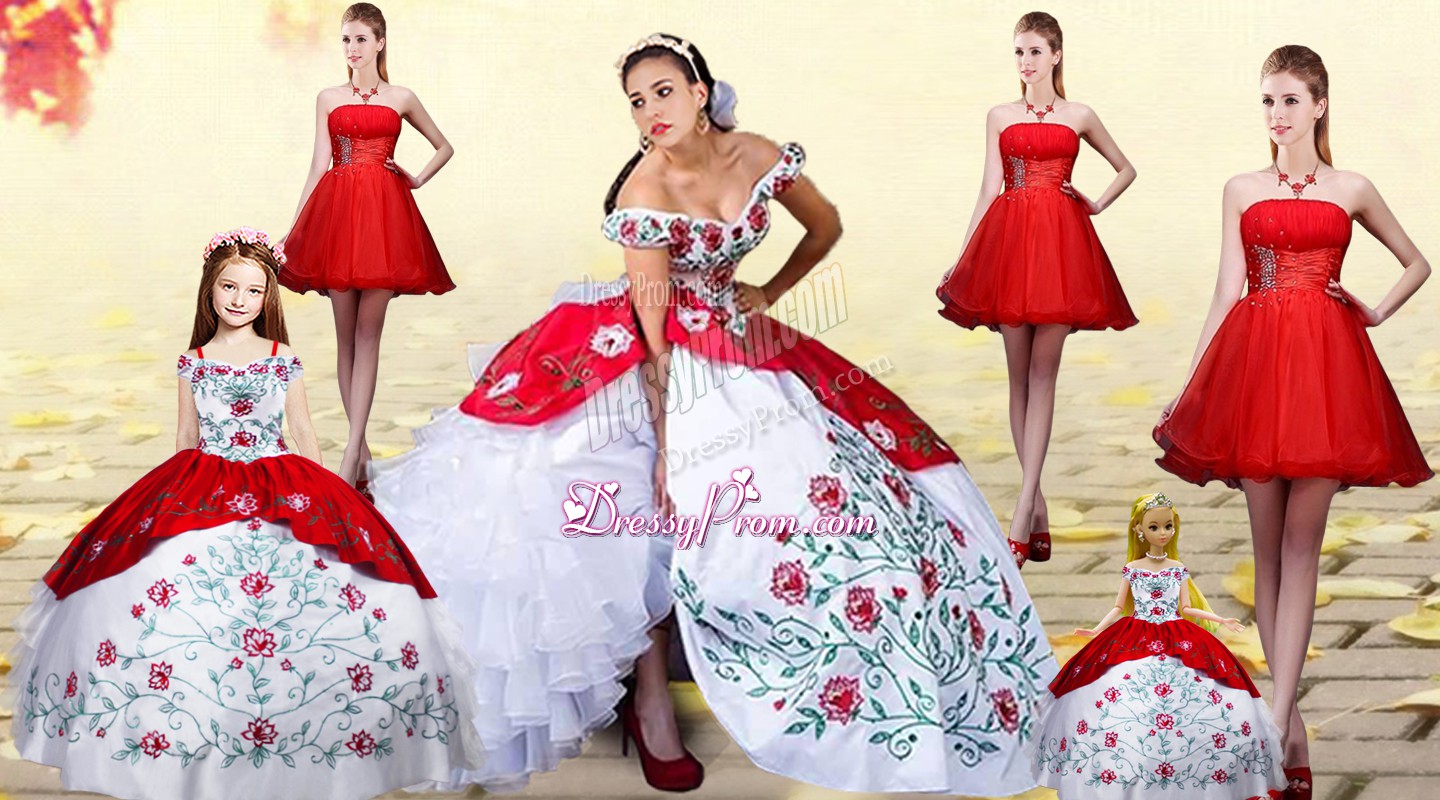 Neckline : Off the shoulder Shown Color : White And Red Silhouette : Ball Gowns Sleeve Length : sleeveless Back Detail : Lace up Fabric : Organza,Taffeta Embellishment : Embroidery,Ruffled Layers Occasion : Military Ball,Sweet 16,Quinceanera Season : Spring,Summer,Fall,Winter