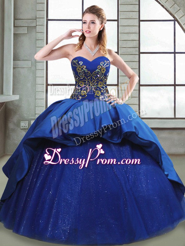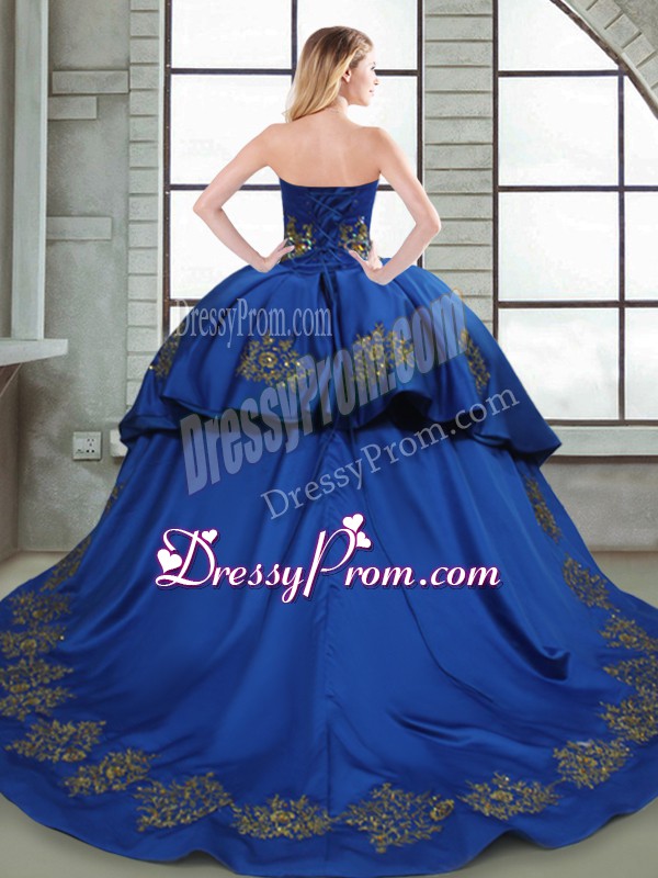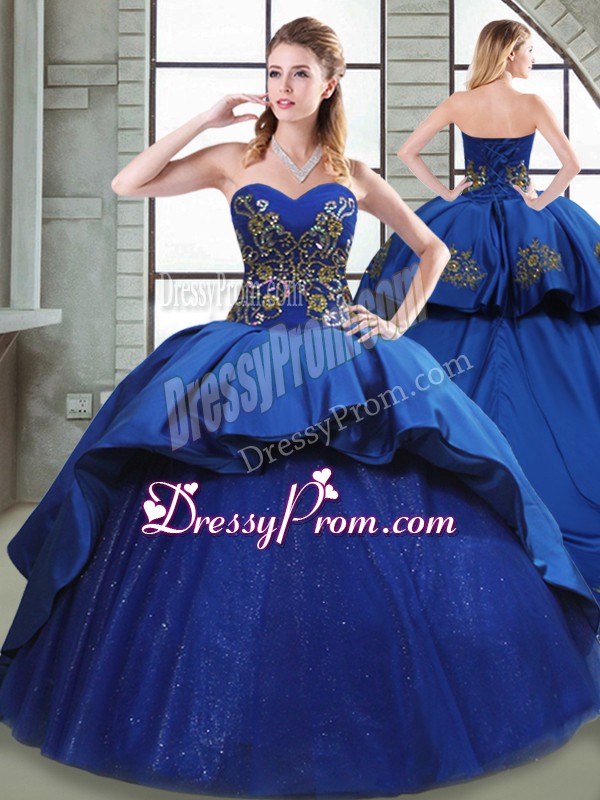 Neckline : SweetheartShown Color : BlueSilhouette : Ball GownsSleeve Length : sleevelessBack Detail : Lace upFabric : TaffetaEmbellishment : Beading,Appliques,EmbroideryOccasion : Military Ball,Sweet 16,QuinceaneraSeason : Spring,Summer,Fall,Winter