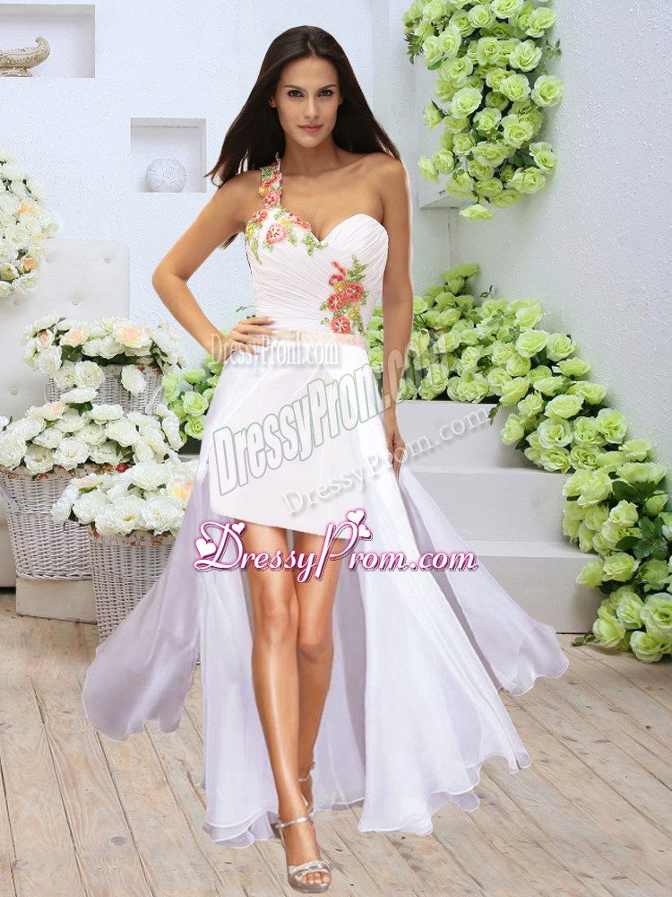 Neckline : One shoulderShown Color : WhiteSilhouette : EmpireSleeve Length : sleevelessHemline : mini lengthBack Detail : ZipperFabric : Elastic Woven SatinEmbellishment : AppliquesOccasion : Prom,PartySeason : Spring,Summer,Fall